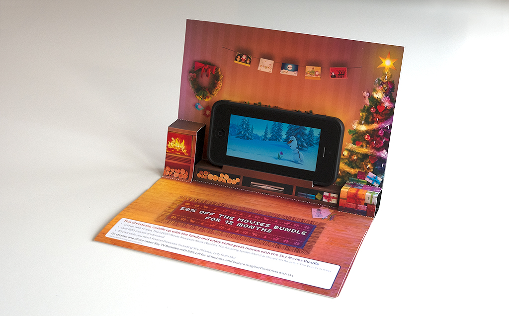 For the Sky Xmas DM we created a pop-up living room that doubled as a mobile phone stand. By scanning a QR code with the phone you would gain access to a piece of exclusive Sky Movies content.